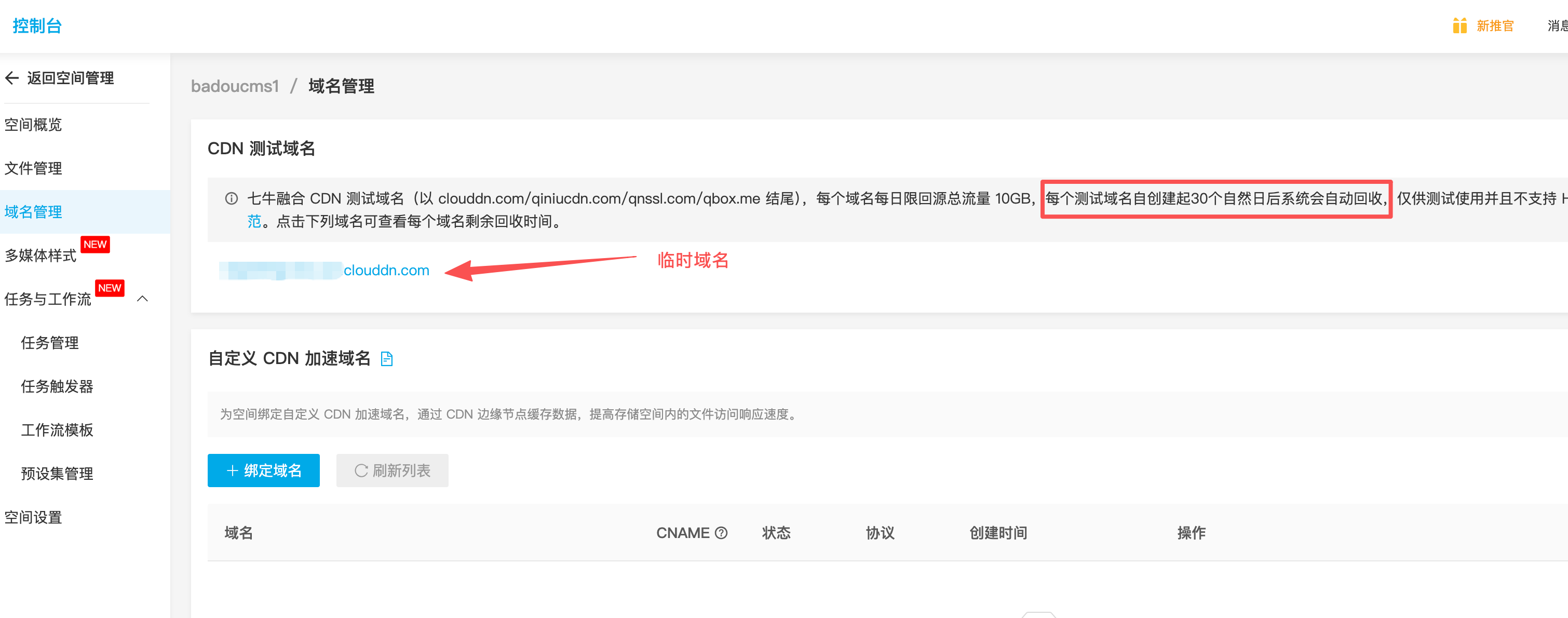 可以绑定自己的域名,或者先试用临时域名,不过需要注意临时域名只有30天有效期