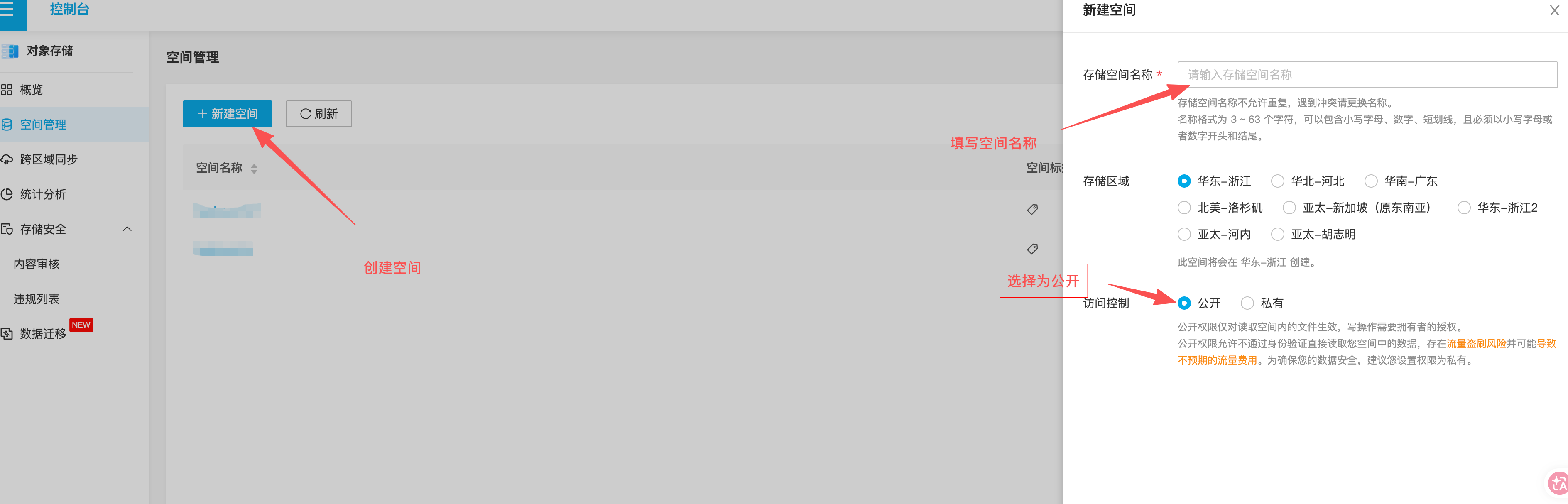 自行建立存储空间,请将 访问控制 设置为 公开,建立之后将空间名称填写到后台的对应位置