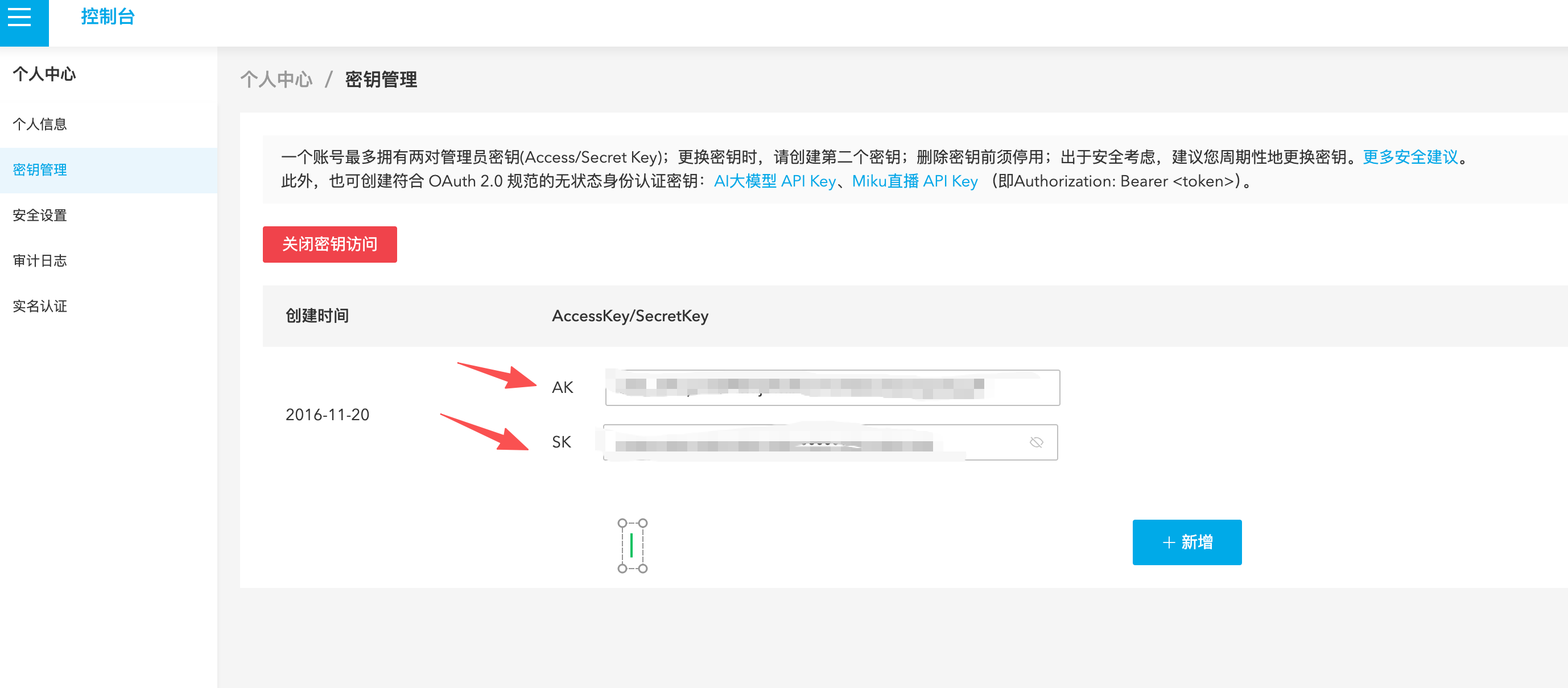 从https://portal.qiniu.com/user/key取得账户的AccessKey和SecretKey